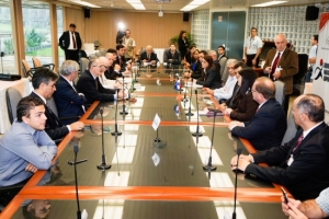 Encontro na sala de reuniões do Edifício de Produção, na Itaipu: apoio ao esporte.